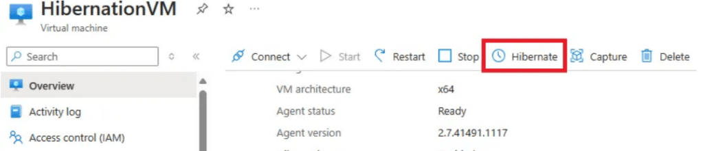 Habilite a Hibernação: No portal do Azure, selecione a VM desejada e navegue até as configurações de Hibernação ou Stop (Hibernar). Ative o recurso conforme as opções disponíveis.