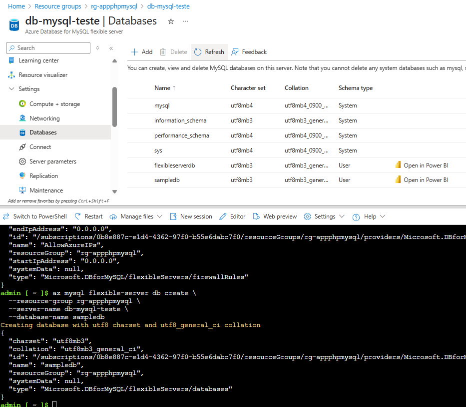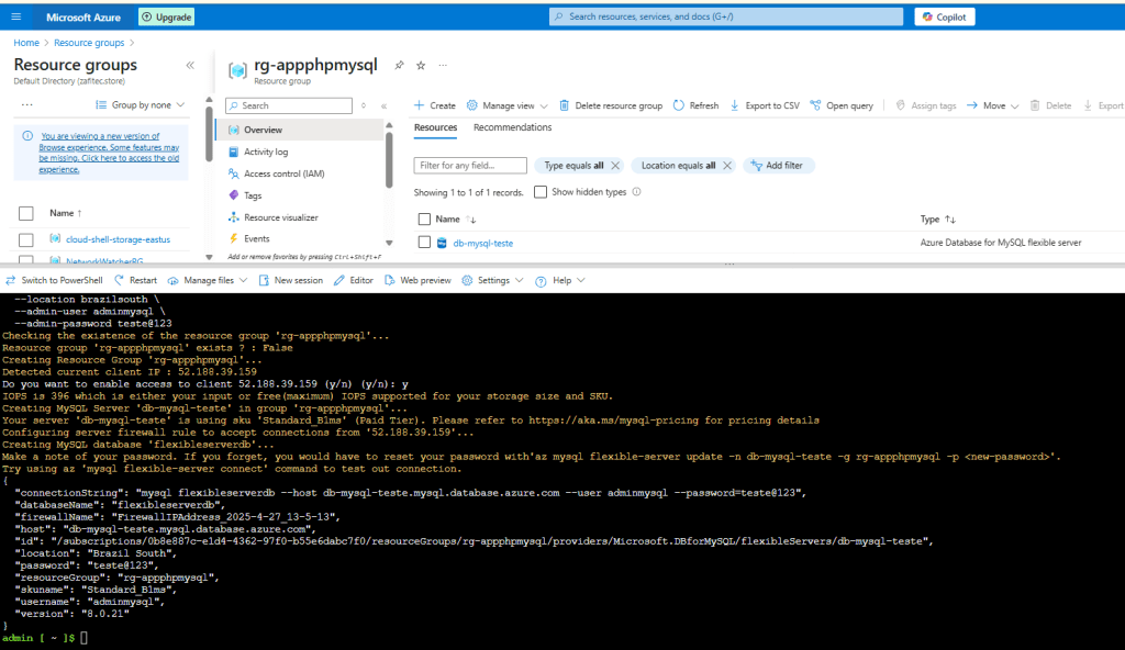 az mysql flexible-server create \ --name db-mysql-teste \ --resource-group rg-appphpmysql \ --location brazilsouth \ --admin-user adminmysql \ --admin-password teste@123 obs: surgirá um informação na tela para confirmar o acesso do seu ip público a aplicação, pressione "y" para confirmar Depois, crie uma regra de firewall para permitir acesso: