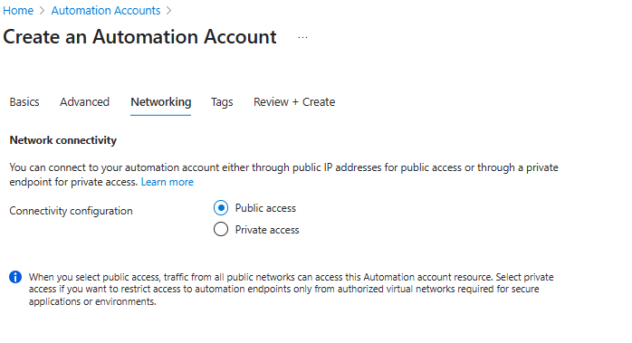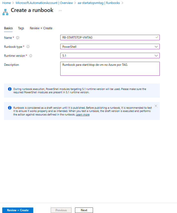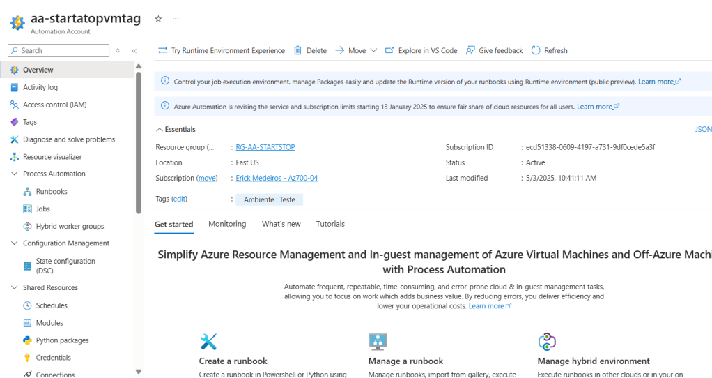 Neste exemplo crio uma conta de automação chamada aa-startstopvmtag, seguindo um padrão: