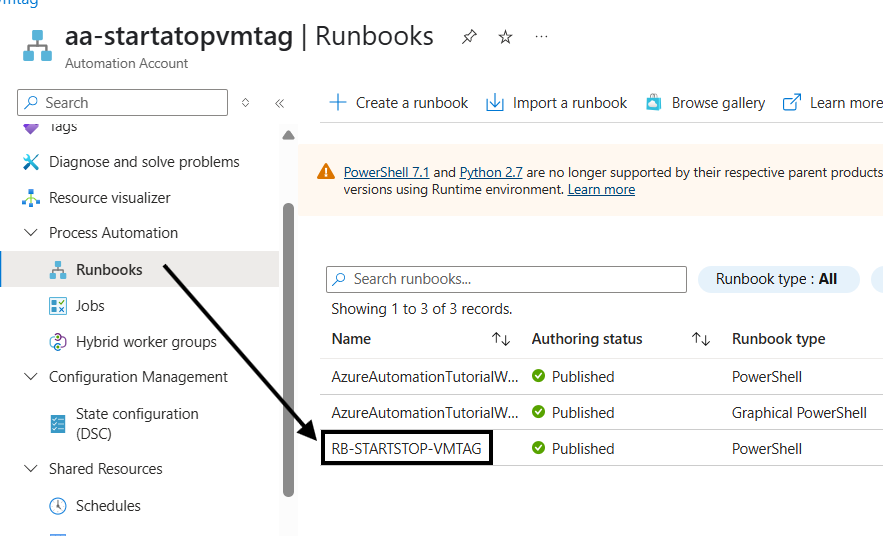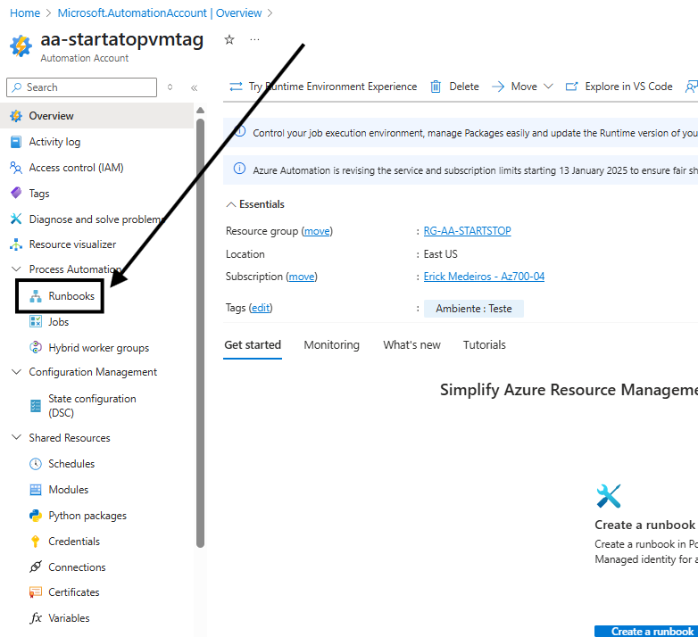 Agora na conta de automação vamos acessar a opção Runbook para criar um customizado: