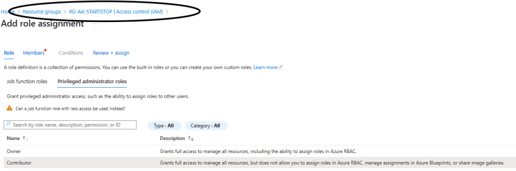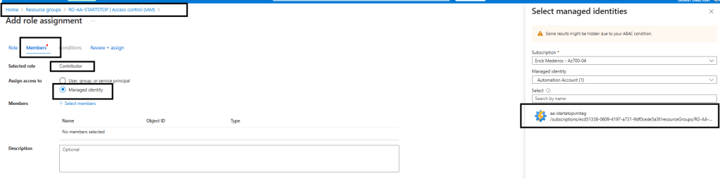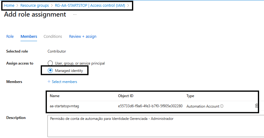 Iremos dá uma permissão para a conta de automação de Contributor. Vamos escolher a opção de Managed Identity e selecionar a conta de automação:
