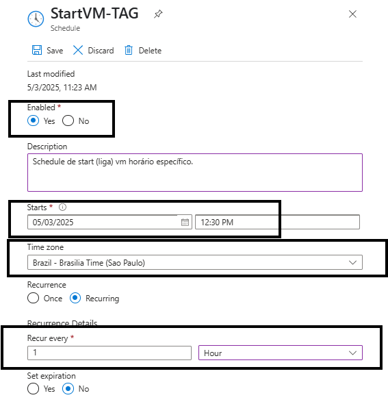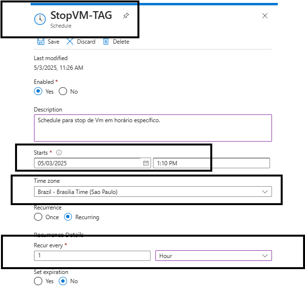Obs: exemplo a seguir utiliza um agendamento para ligar e desligar a VM a cada hora como exemplo desta publicação. Você pode alterar a TAG = AutoShutdowm e seu valor também no script. Há tag que estiver no script dever ser aplicada igualmente na marcação da máquina virtual.