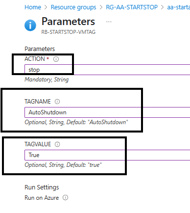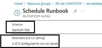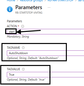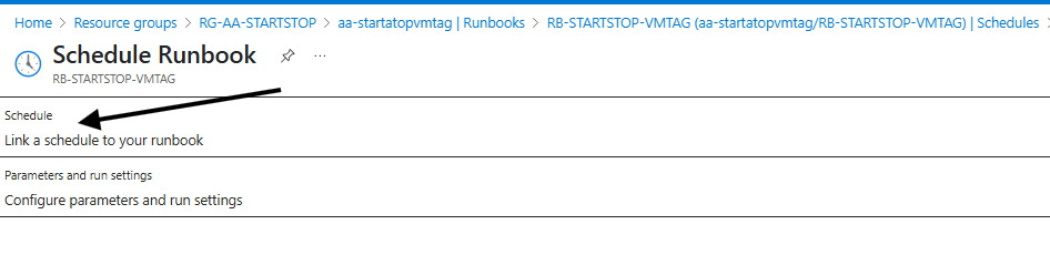 Vamos criar duas opção para start e depois stop. Selecione o Schedule StartVM-TAG. Digitando o comandos start, em seguida as tags configuradas na máquina virtual.