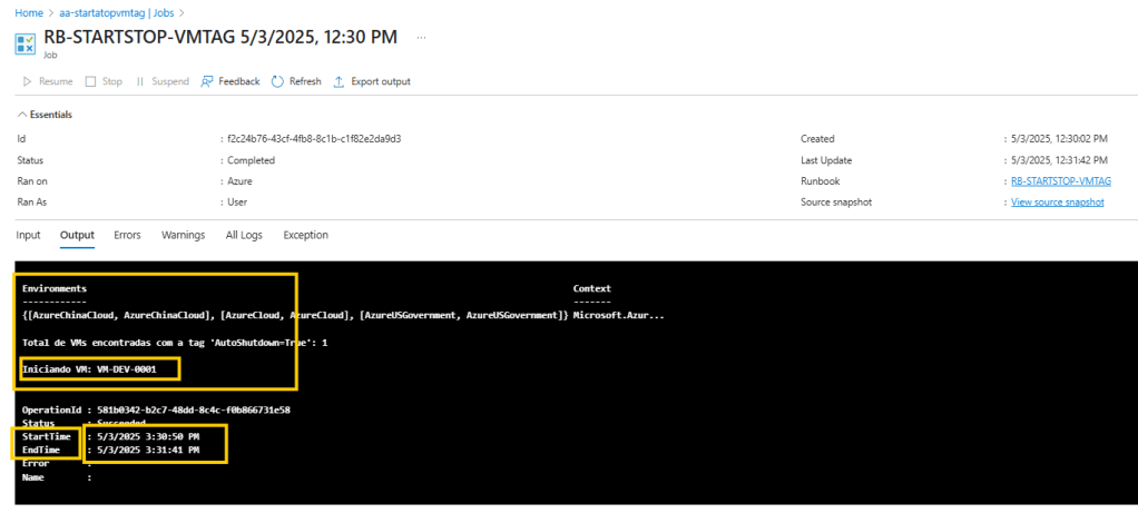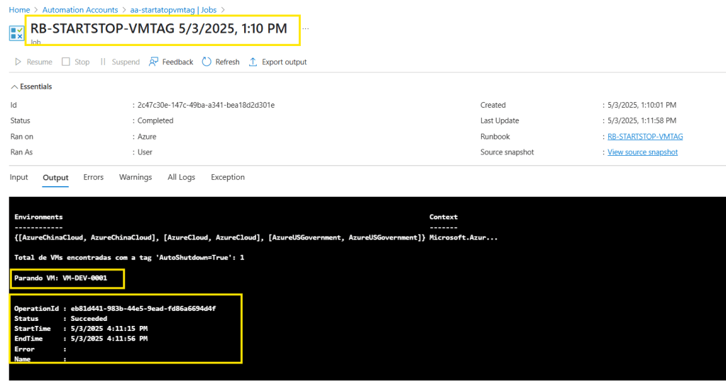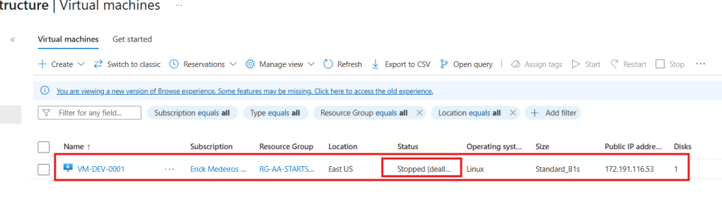 AutoShutdown = true); - Verificar o status atual da VM;