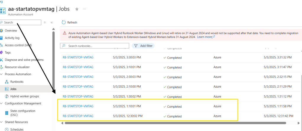 Vamos criar o agendamento para Stop-VM, segue a mesma configuração anterior para um horário posterior para desligar a vm. Agora quando a Vm estiver com o status de “running”, desligará a mesma.