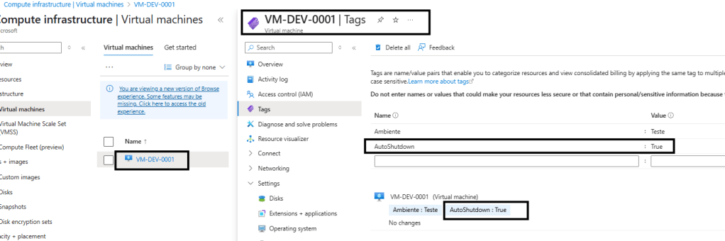 2. Na VM vamos definir a tag e seu valor: aqui iremos usando AutoShutdown com o valor True.