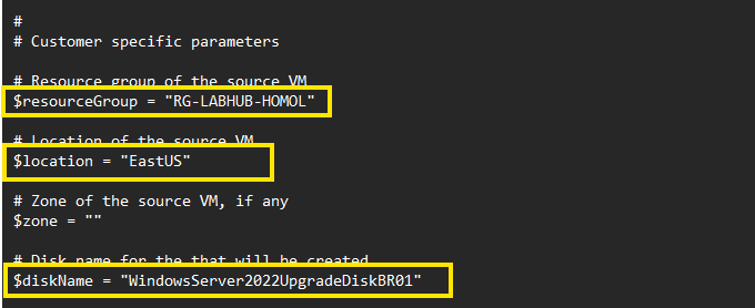 Obs: no código altere o resource group onde vc vai guardar o disco, a região onde a máquina foi criada e o nome do disco.