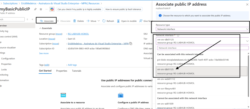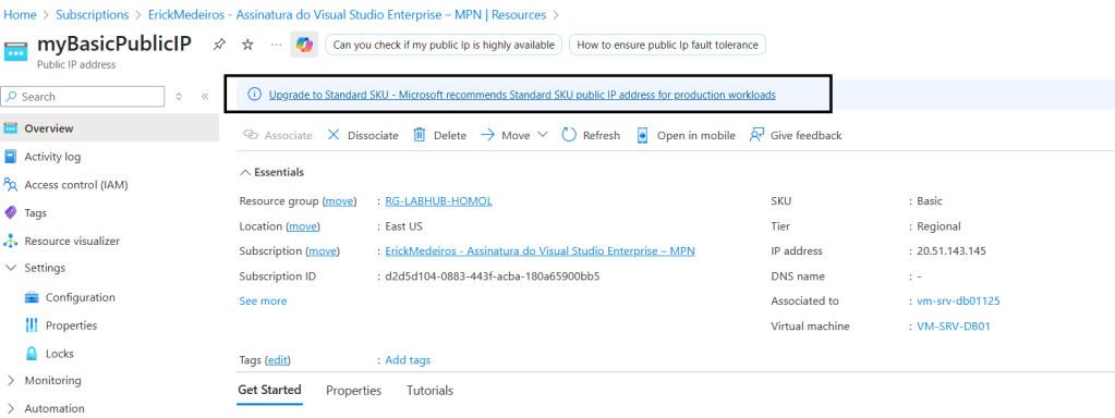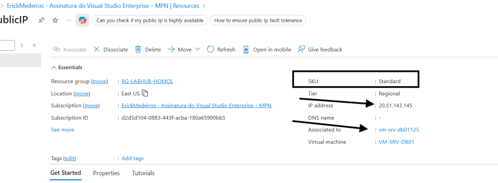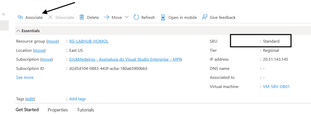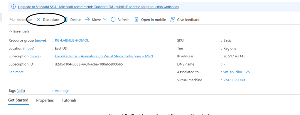 04 – Acesse o IP público que está com SKU Basic e clique na opção Dissociate.