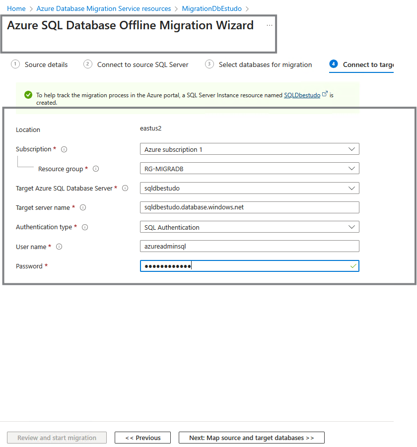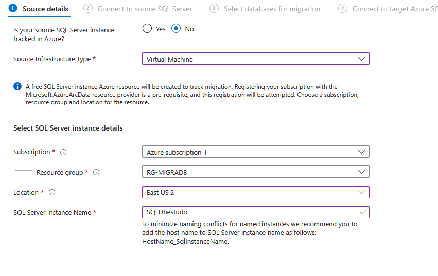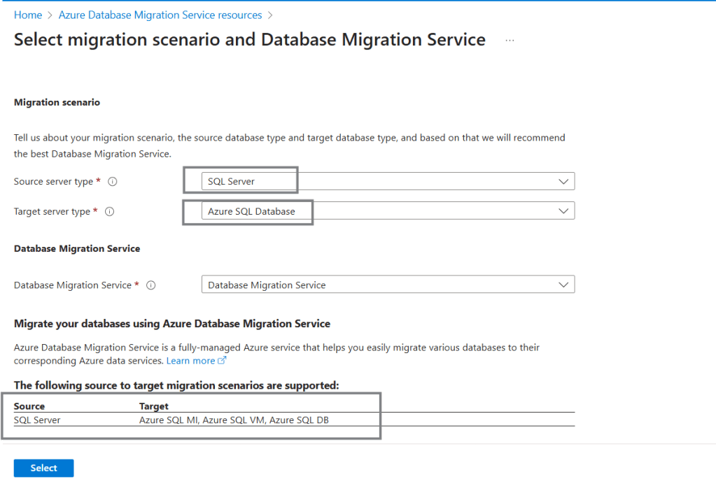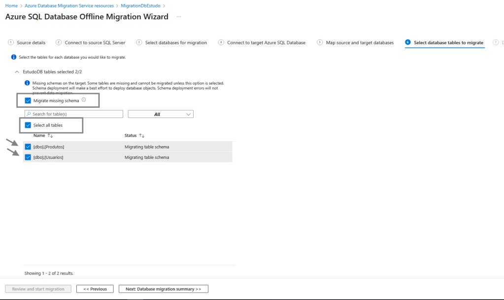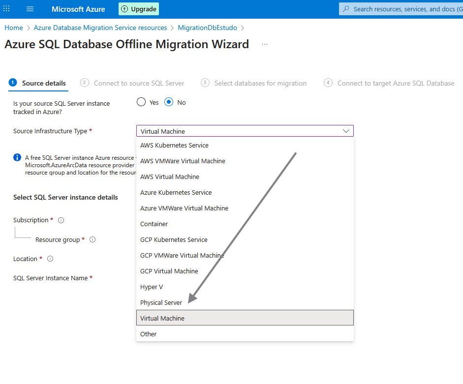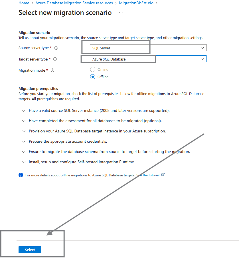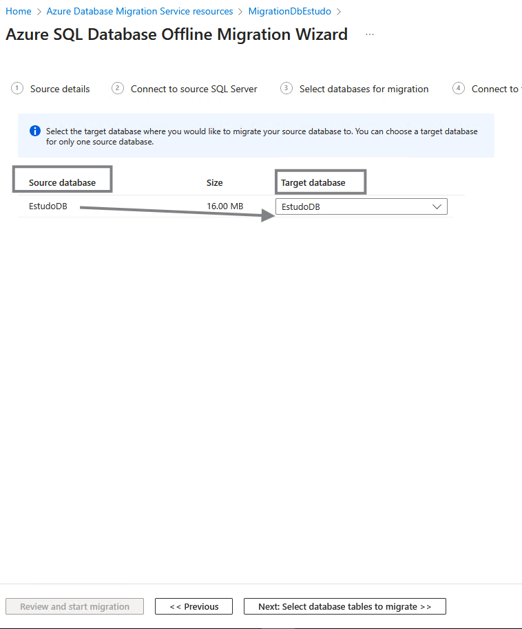 Segue selecionando o cenário e tipo recursos de database de origem e destino