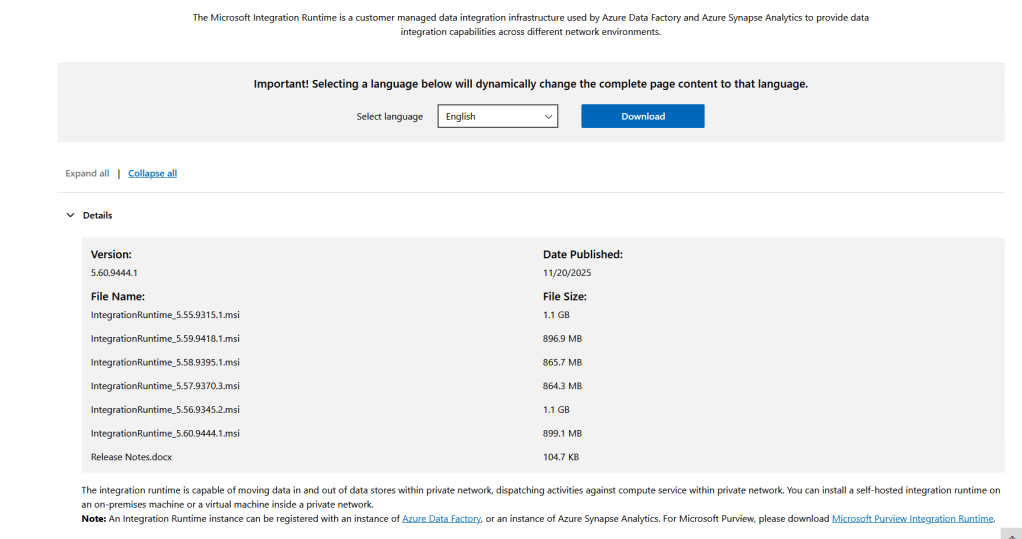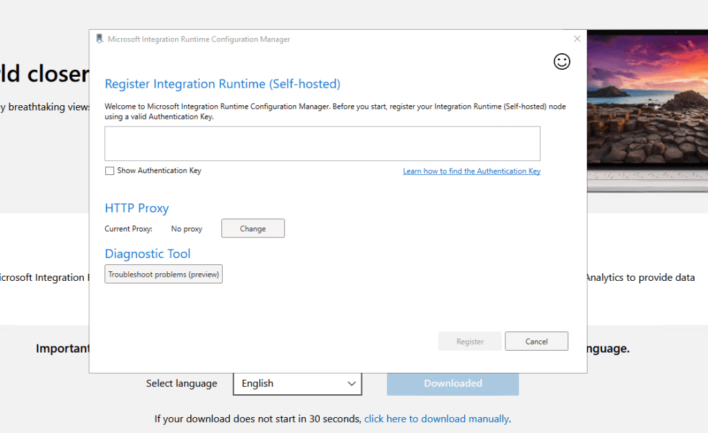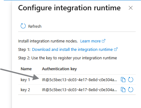 Vamos realizar primeiro o download da Integration Run time e copiar em um bloco de nota uma das chaves para autenticação