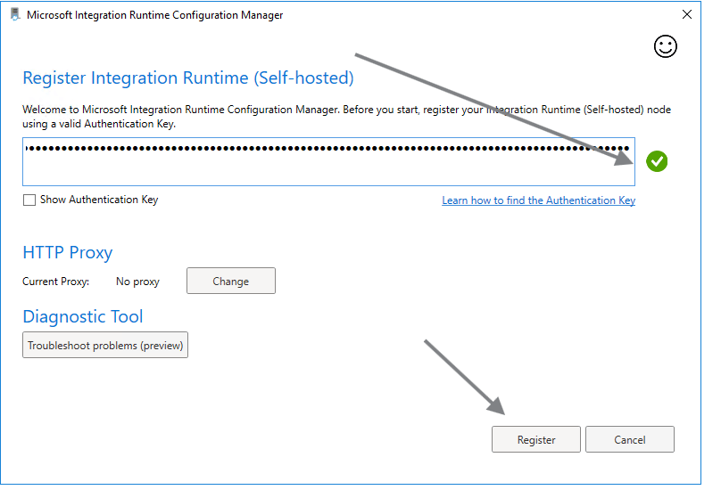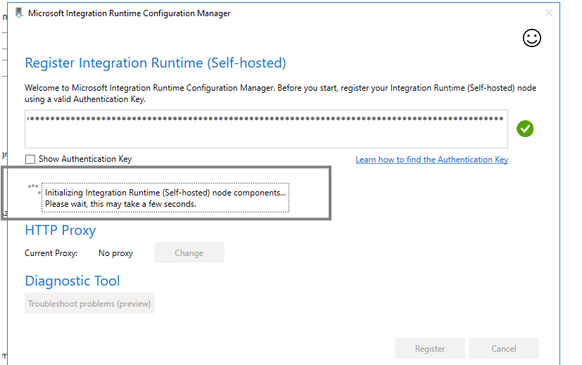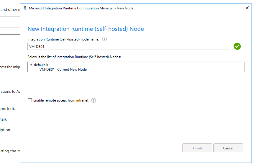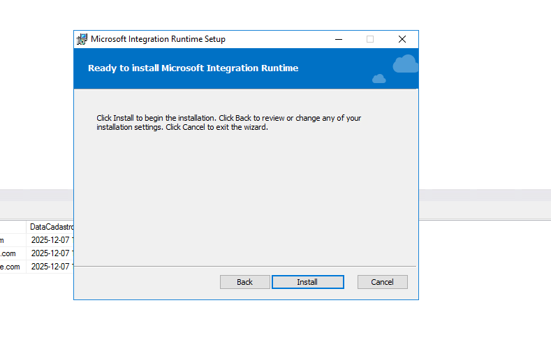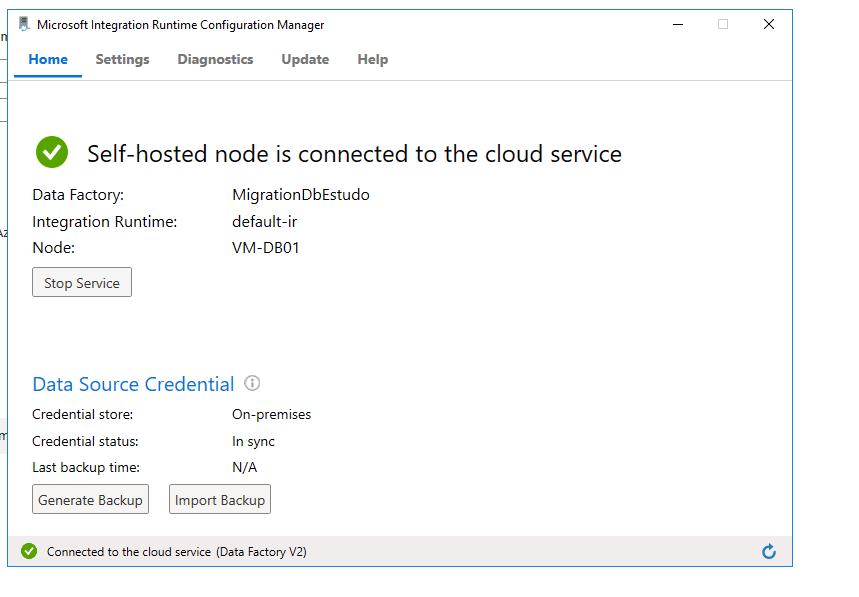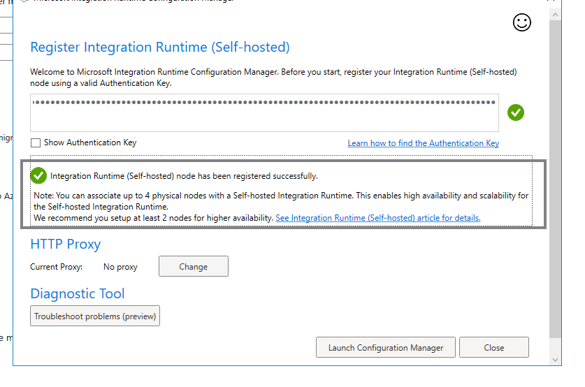 Depois de finalizar a instalação a janela de configuração do Integration Runtime (Sef-hosted)
