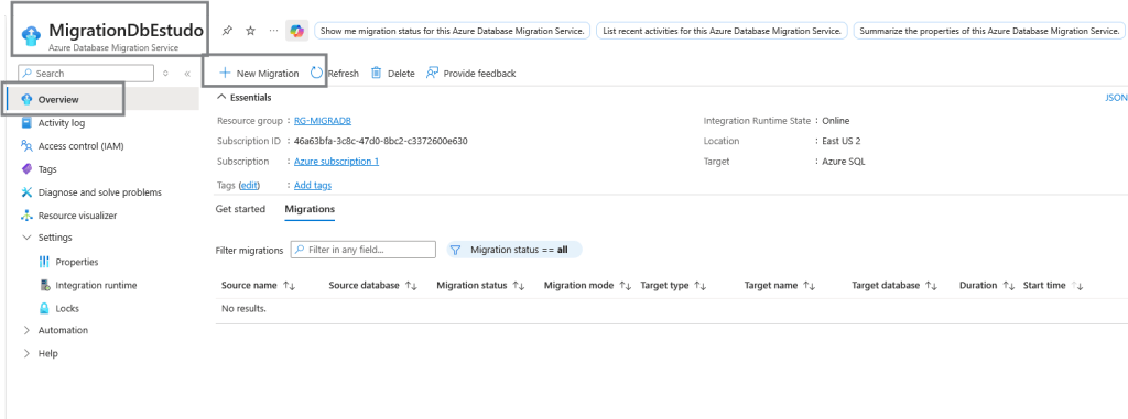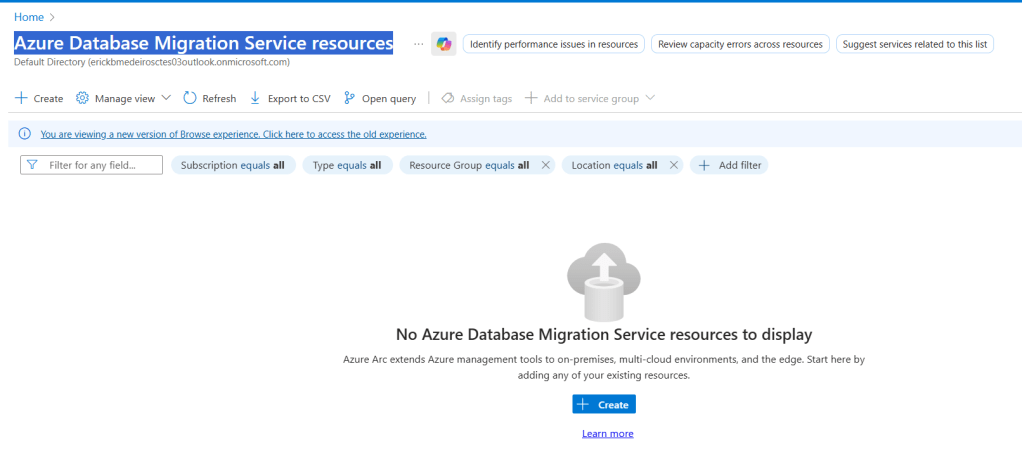 No Azure, busque por Azure Data Migration Service e crie um novo projeto de migração