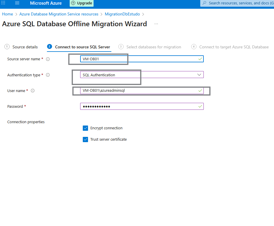 e colocar os parâmetros de configuração do servidor (instância SQL de origem)