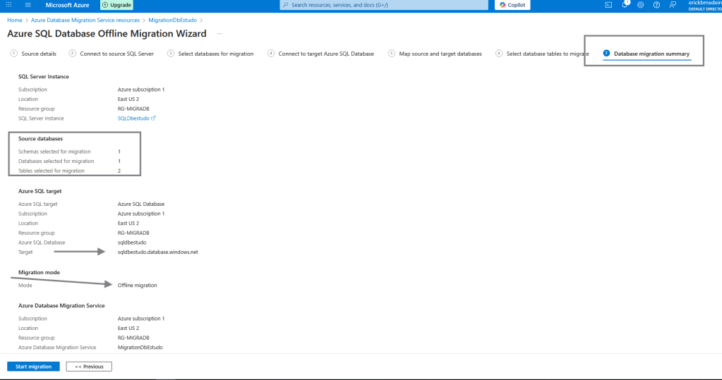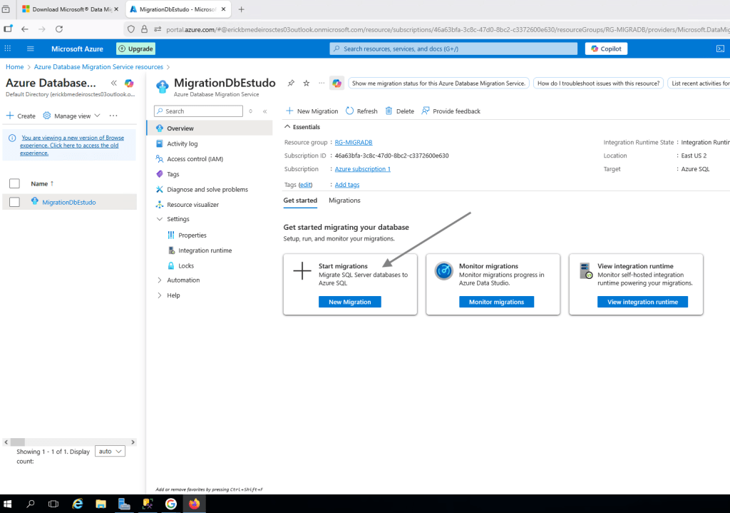 stou autenticado no Azure e agora dentro do servidor, origem da base de dados que será migrada para o Azure SQL Database por meio do Azure Database Migration Service. Vamos da inicio ao processo de Migração clicando na opção Start Migration.