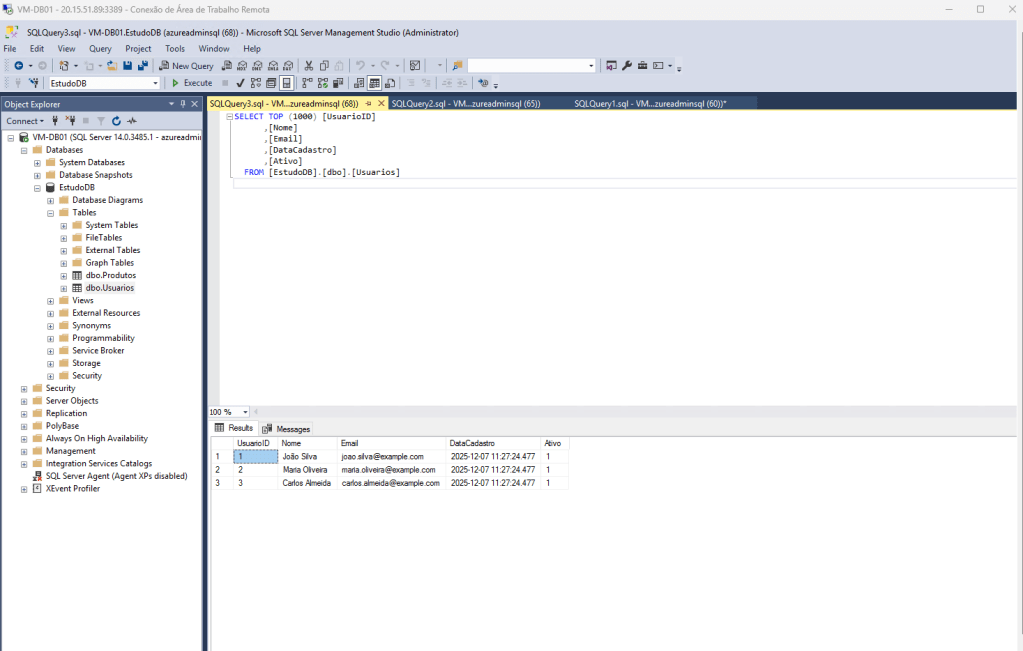 O scrit cria uma base de dados chamada de EstudoDB. Estou utilizando um servidor Windows Server 2016 com SQL Data Base 2017.