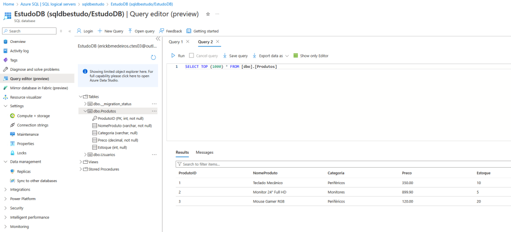 Criei uma instância de base de dados no Azure SQL Database com o mesmo da instância Local, EstudoDB.
