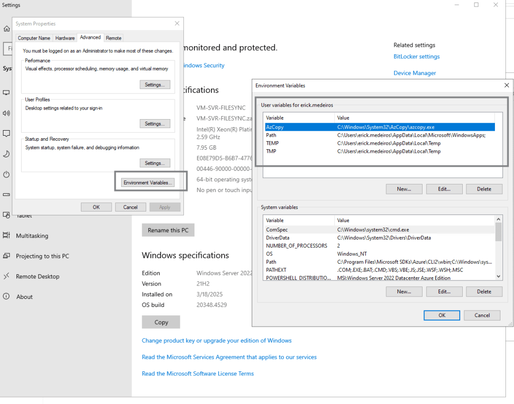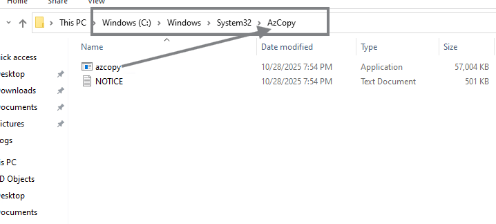 Criei uma pasta AzCopy, conforme imagem, dentro da pasta Windows>System32>AzCopy