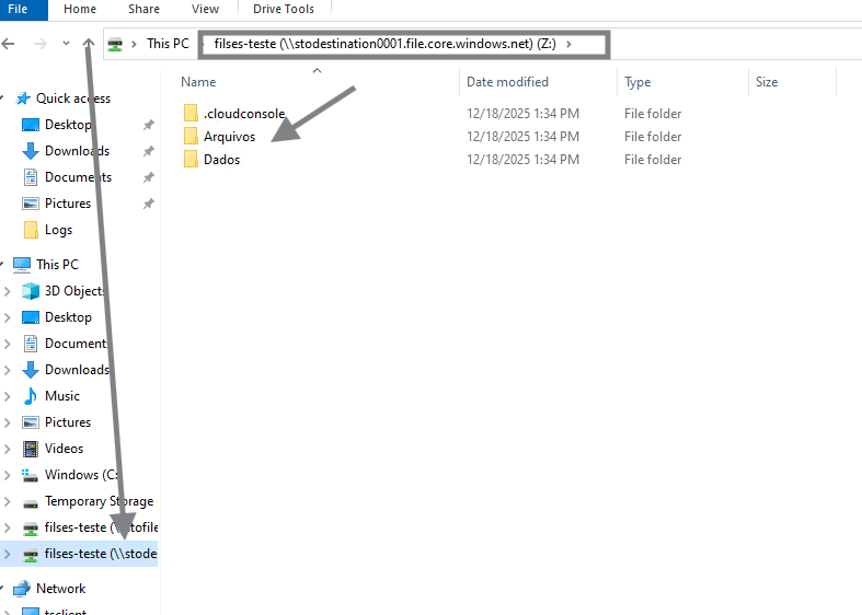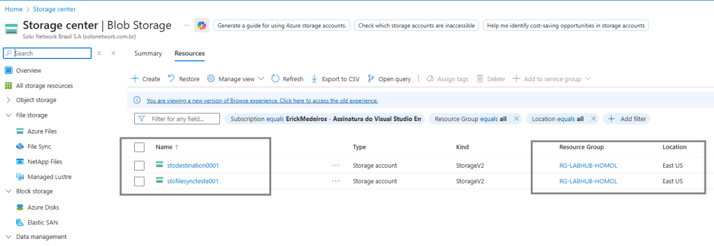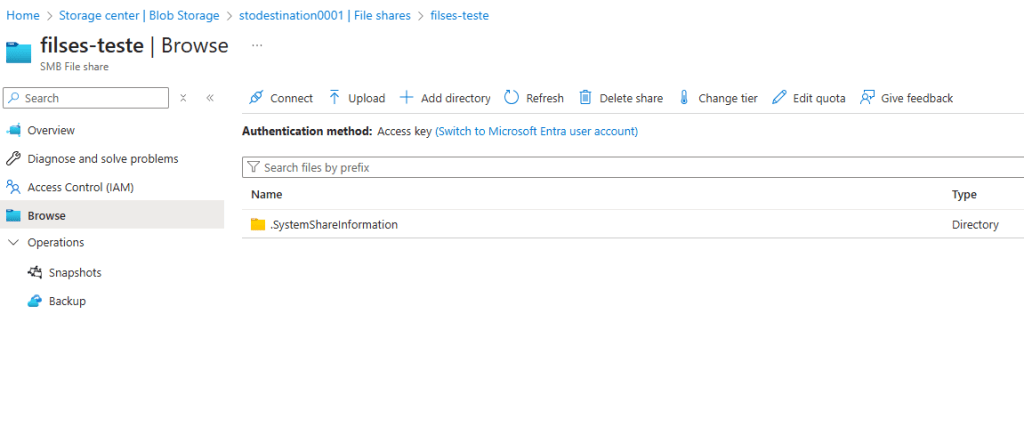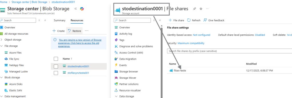 Storage de Destino: ele tem o File Share criado com o mesmo nome de origem e vazio, conforme imagens abaixo.