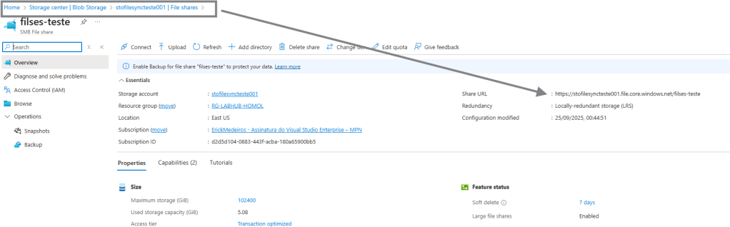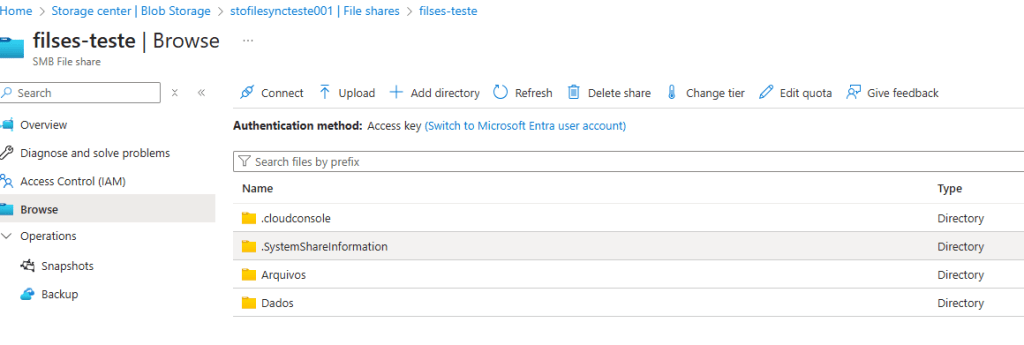 Storage File Share – utilizarei um caso bastante comum; usando o pasta smb contendo alguns arquivos e pastas chamada de filses-teste.
