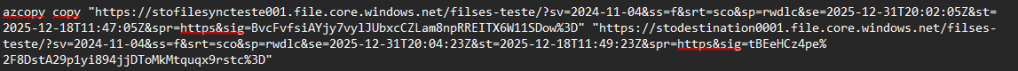 azcopy copy “https://stofilesyncteste001.file.core.windows.net/filses-teste/?sv=2024-11-04&ss=f&srt=sco&sp=rwdlc&se=2025-12-31T20:02:05Z&st=2025-12-18T11:47:05Z&spr=https&sig=BvcFvfsiAYjy7vylJUbxcCZLam8npRREITX6W11SDow%3D” “https://stodestination0001.file.core.windows.net/filses-teste/?sv=2024-11-04&ss=f&srt=sco&sp=rwdlc&se=2025-12-31T20:04:23Z&st=2025-12-18T11:49:23Z&spr=https&sig=tBEeHCz4pe%2F8DstA29p1yi894jjDToMkMtquqx9rstc%3D“