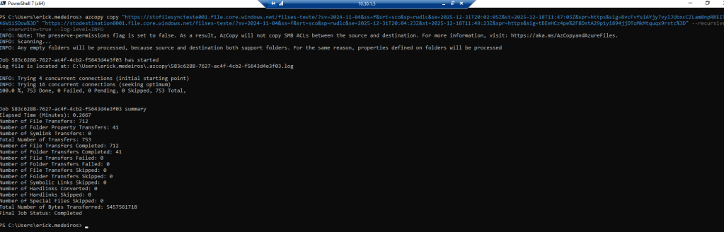 azcopy copy “https://stofilesyncteste001.file.core.windows.net/filses-teste/?sv=2024-11-04&ss=f&srt=sco&sp=rwdlc&se=2025-12-31T20:02:05Z&st=2025-12-18T11:47:05Z&spr=https&sig=BvcFvfsiAYjy7vylJUbxcCZLam8npRREITX6W11SDow%3D” “https://stodestination0001.file.core.windows.net/filses-teste/?sv=2024-11-04&ss=f&srt=sco&sp=rwdlc&se=2025-12-31T20:04:23Z&st=2025-12-18T11:49:23Z&spr=https&sig=tBEeHCz4pe%2F8DstA29p1yi894jjDToMkMtquqx9rstc%3D” –recursive=true –overwrite=true –log-level=INFO