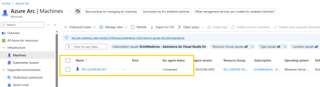 Após a replicação da diretiva, os servidores começarão a aparecer no Portal do Azure sob a lâmina do Azure Arc. A partir desse momento, você pode aplicar Azure Policy, configurar o Microsoft Defender for Cloud e gerenciar atualizações de forma centralizada.
