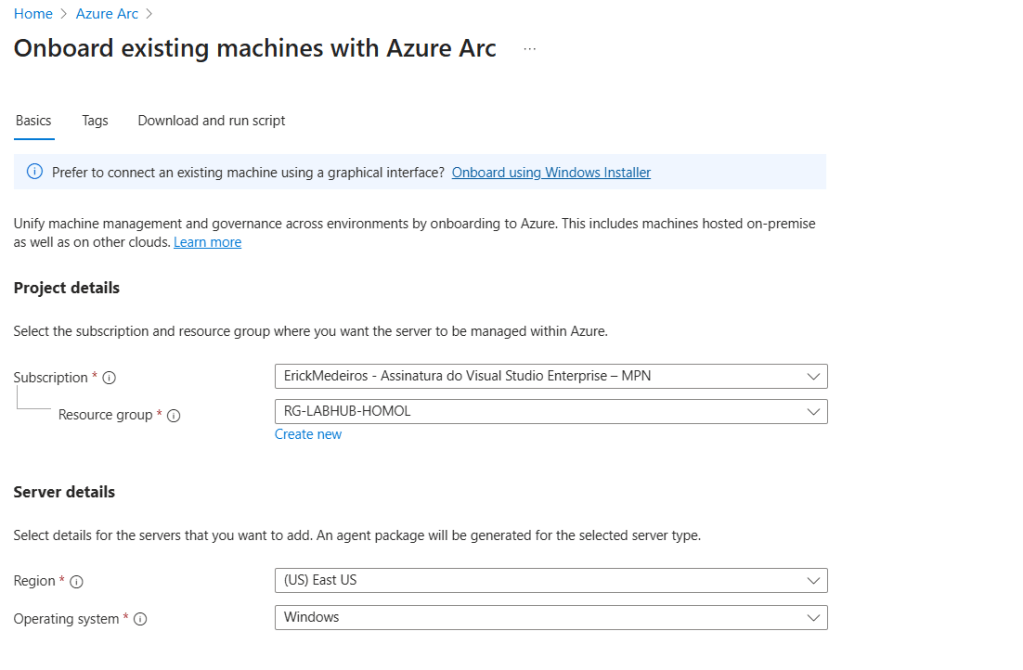 Para automação em escala, não utilizamos credenciais de usuário. Criamos um Service Principal no Azure com a função específica de “Azure Connected Machine Onboarding”. Isso limita as permissões apenas ao necessário para registrar a máquina, aumentando a segurança do processo.