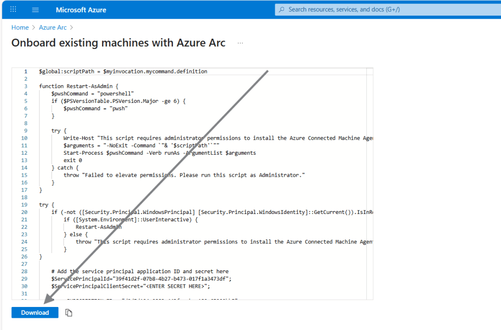 A Microsoft fornece um script PowerShell modelo que deve ser editado com as informações do seu ambiente (Tenant ID, Subscription ID, Resource Group e as credenciais da Entidade de Serviço). Este script será o “coração” da sua GPO.
