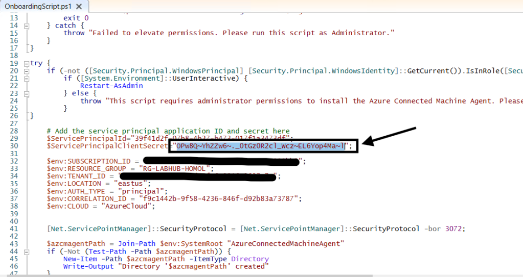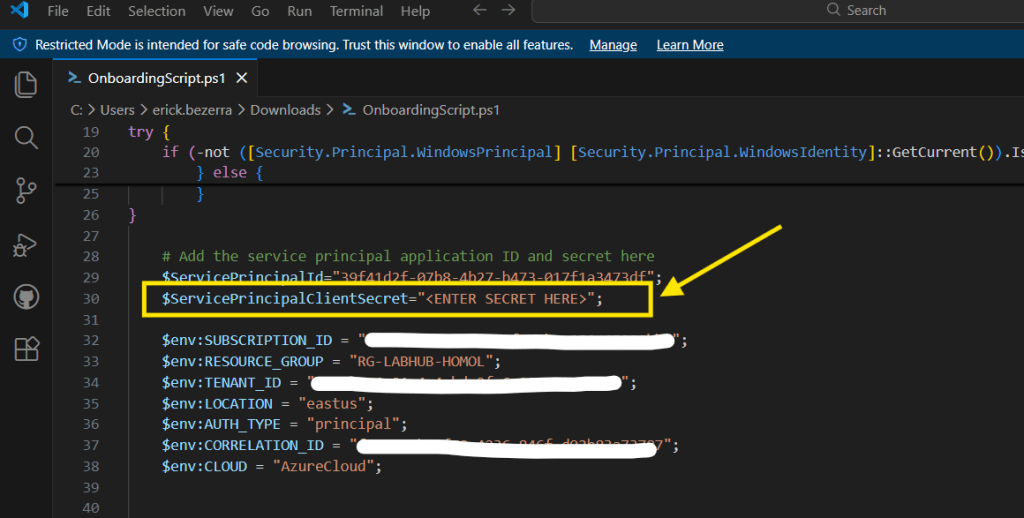 Vamos realizar a edição deste script para inserir o Value (valor do Secret ID do Service Principal criado).